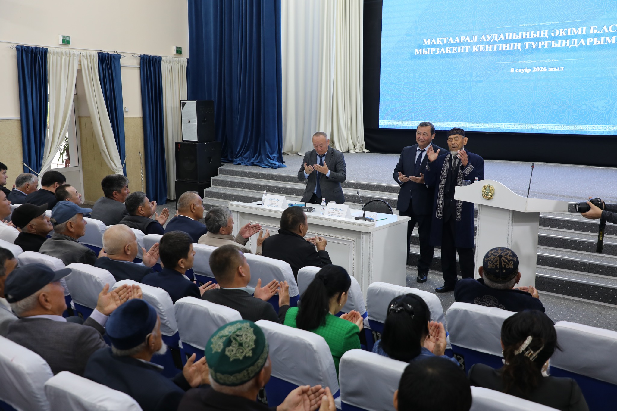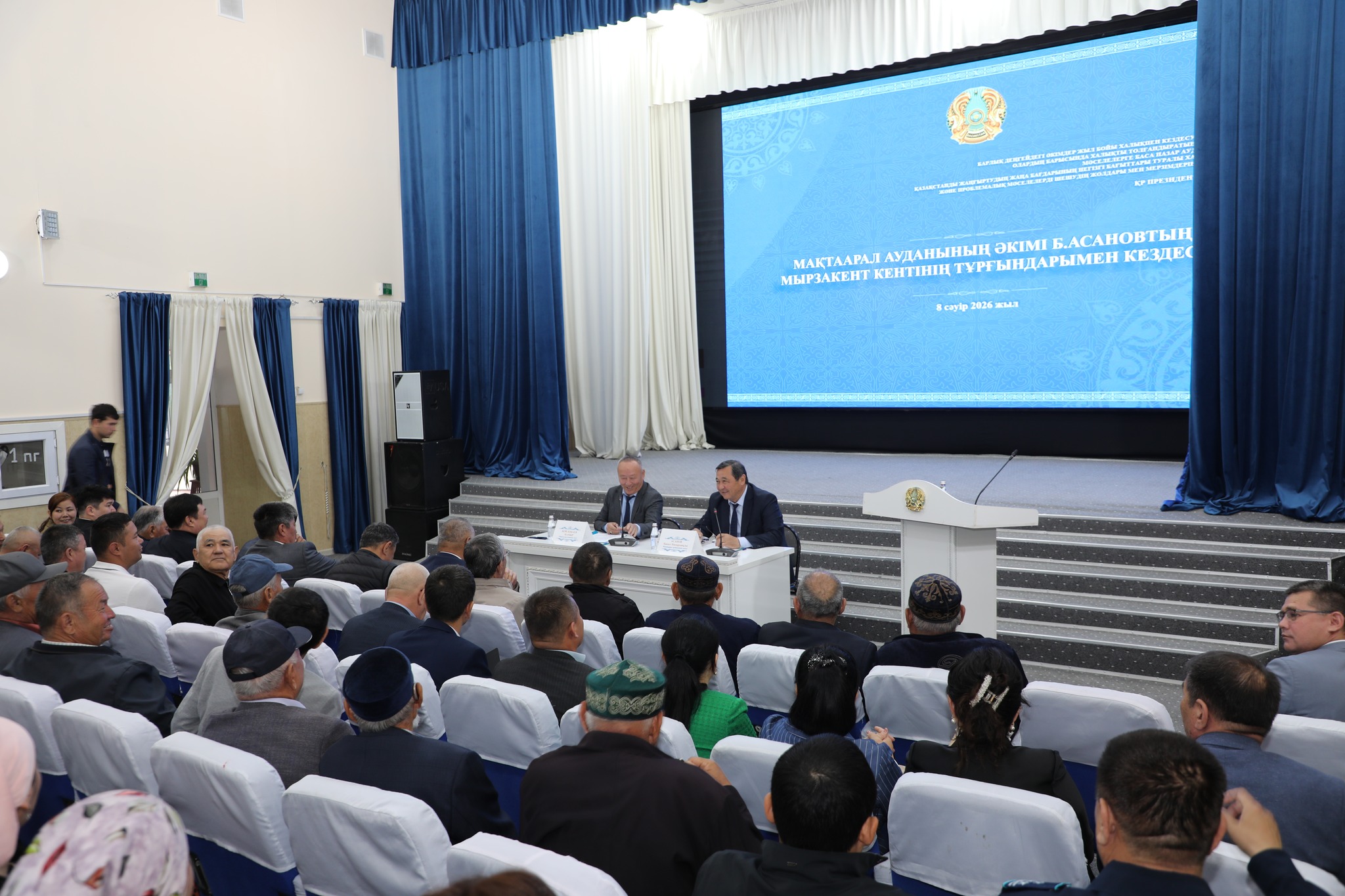 Мақтаарал ауданының әкімі Бақыт Асанов кенттер мен ауылдық округтердегі тұрғындарымен өткен жоспарлы кездесулерін қорытындылап, ең соңында аудан орталығы Мырзакент кентінің тұрғындарына есеп берді.