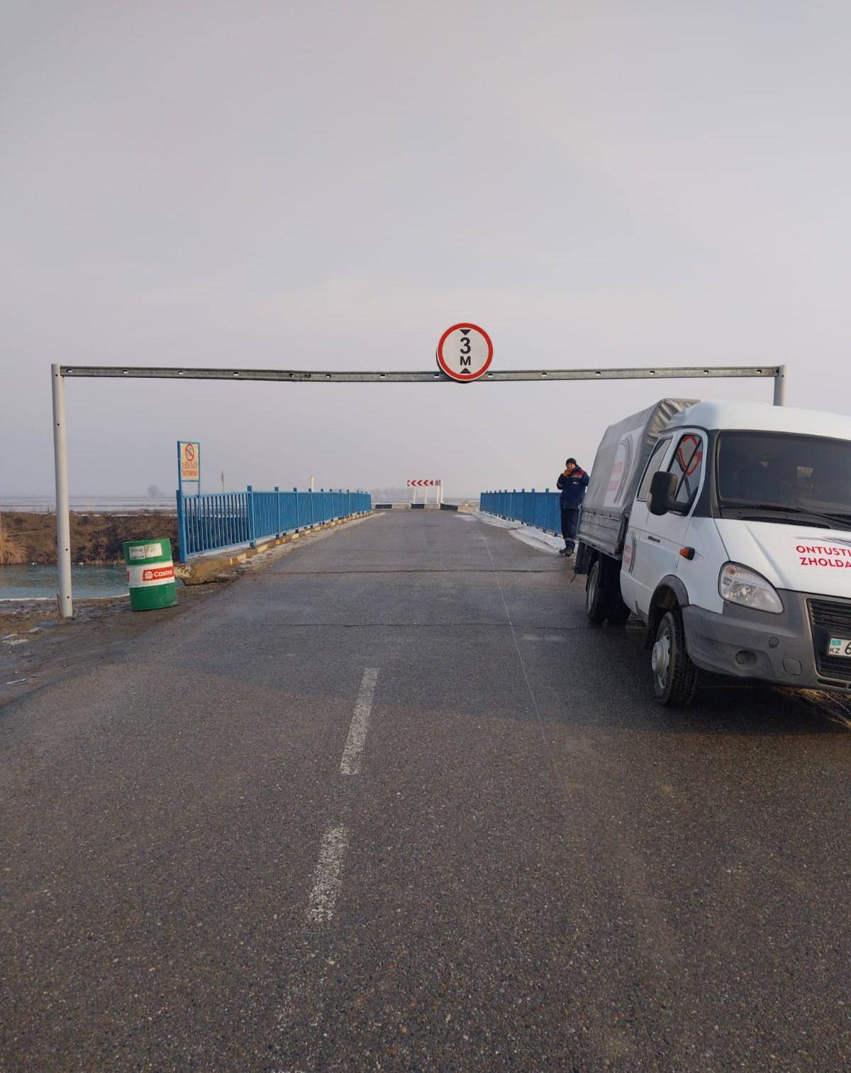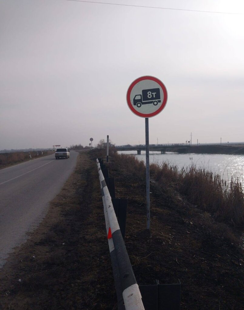 Сонымен қатар, жүргізушілердің қауіпсіздігін қамтамасыз ету және жол қозғалысын реттеу мақсатында көпірдің қауіпті жағдайда екенін ескертетін, сондай-ақ жүк көліктерінің өтуіне шектеу қоятын арнайы жол белгілері орнатылды. Аталған белгілер халықаралық стандарттарға сай орналастырылып, түнгі уақытта да жақсы көрінуі үшін жарық шағылыстыратын элементтермен жабдықталған.