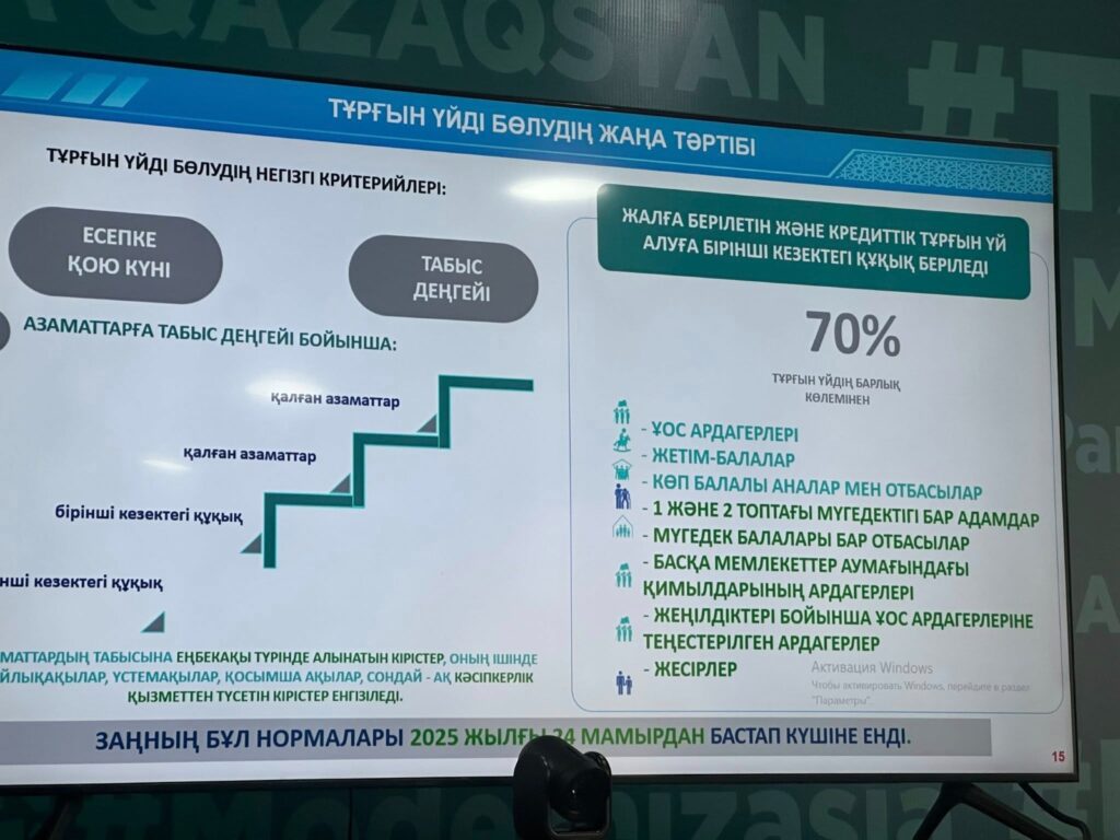 Азаматтардың тұрғын үй кезегіне тұру және оның жүргізілу тәртібі, қолданыстағы тұрғын үй бағдарламасы туралы «Отбасы банк» АҚ Түркістан облыстық филиалының өкілі ақпарат беріп, Orken.otbasybank.kz порталында тұрғын үйге мұқтаж жан ретінде есепке тұру шарттары туралы түсініктеме берді. Тұрғын үйге мұқтаж жан ретінде есепке тұруға өтінім берген кезде жүйе үміткердің талаптарға сәйкестігін автоматты түрде тексеретіні айтылды. Егер ол кәмелетке толған азамат болса және оның, сондай-ақ оның отбасы мүшелерінің соңғы 5 жыл ішінде меншік құқығында тұрғын үйі болмаса, онда ол тізімге енгізілетіні хабарланды. Банк өкілі депутаттармен және партия қызметкерлерімен бірге азаматтарға жаңартылған ережелерді және кезектегі азаматтардың өз мәртебесін қалай білуге болатынын түсіндіруге арналған жиындарға қатысуға дайын екенін жеткізді.