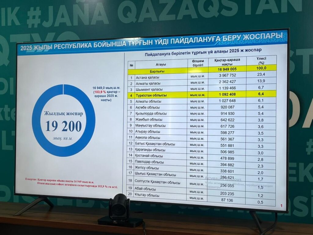 Түркістан облысы бойынша пайдалануға берілген тұрғын үй алаңы қаңтар-қараша аралығындағы кезеңде жоспар бойынша 922 303 шаршы метрді құрауы тиіс болса, нақты көрсеткіші 1 092 408 шаршы метрге жетіп, өткен жылдың тиісті кезеңімен салыстырғанда 105,5 пайызға орындалғаны жайлы облыстық құрылыс басқармасының басшысы Абай Турханов айтты. Басқарма басшысы өз есебінде кредиттік 30 тұрғын үйдің құрылысына бюджеттен 13,8 млрд. теңге бөлініп, толығымен пайдалануға тапсырылғанын мәлімдеді. Құны 7,8 млрд. теңгені құрайтын 564 пәтерге «Отбасы банк» АҚ арқылы конкурс жарияланып, 1 616,4 млн. теңгеге 109 пәтер сатылған.